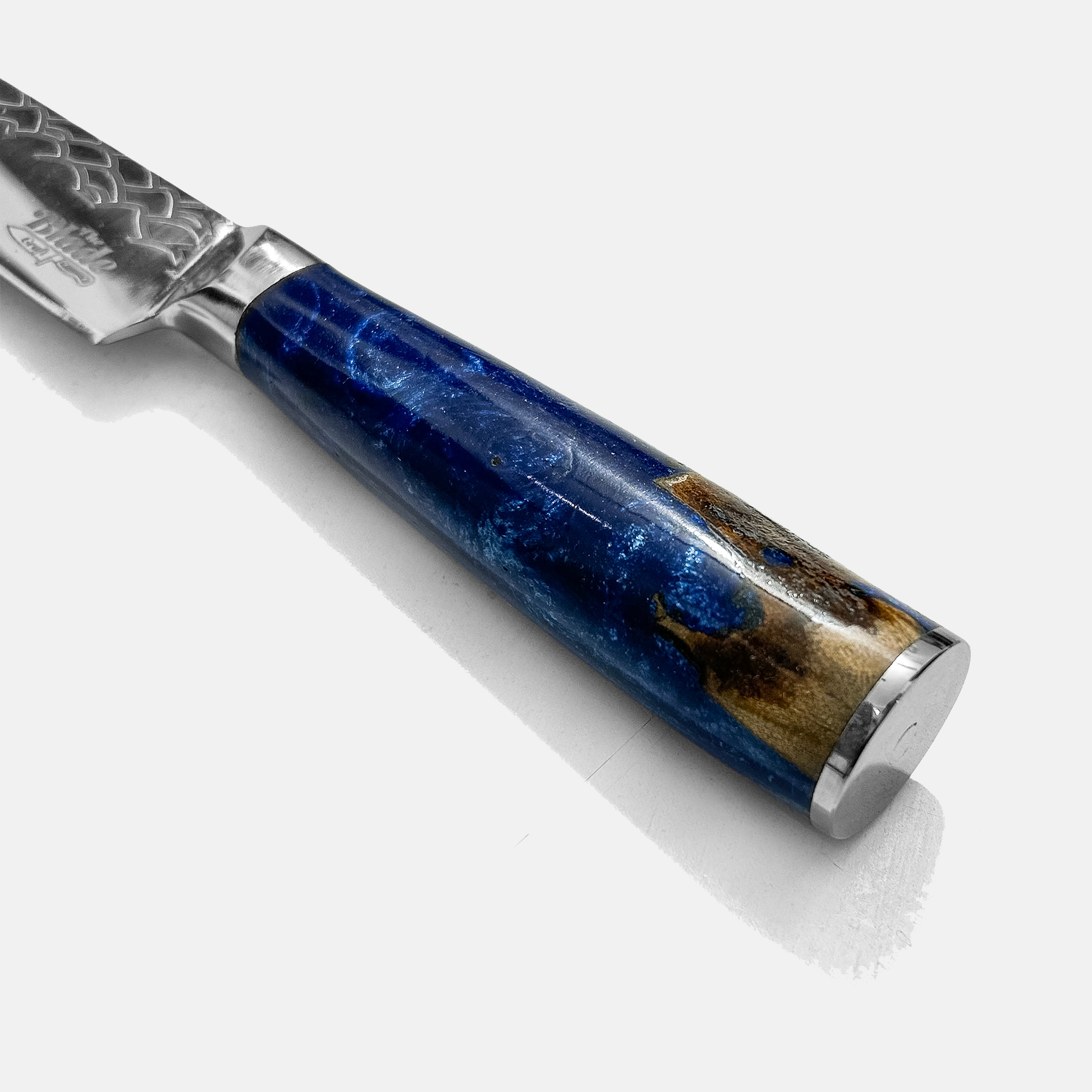 5.1 inches long, combining natural wood and vibrant blue resin, secured with polished rivets for a comfortable, stable grip.
