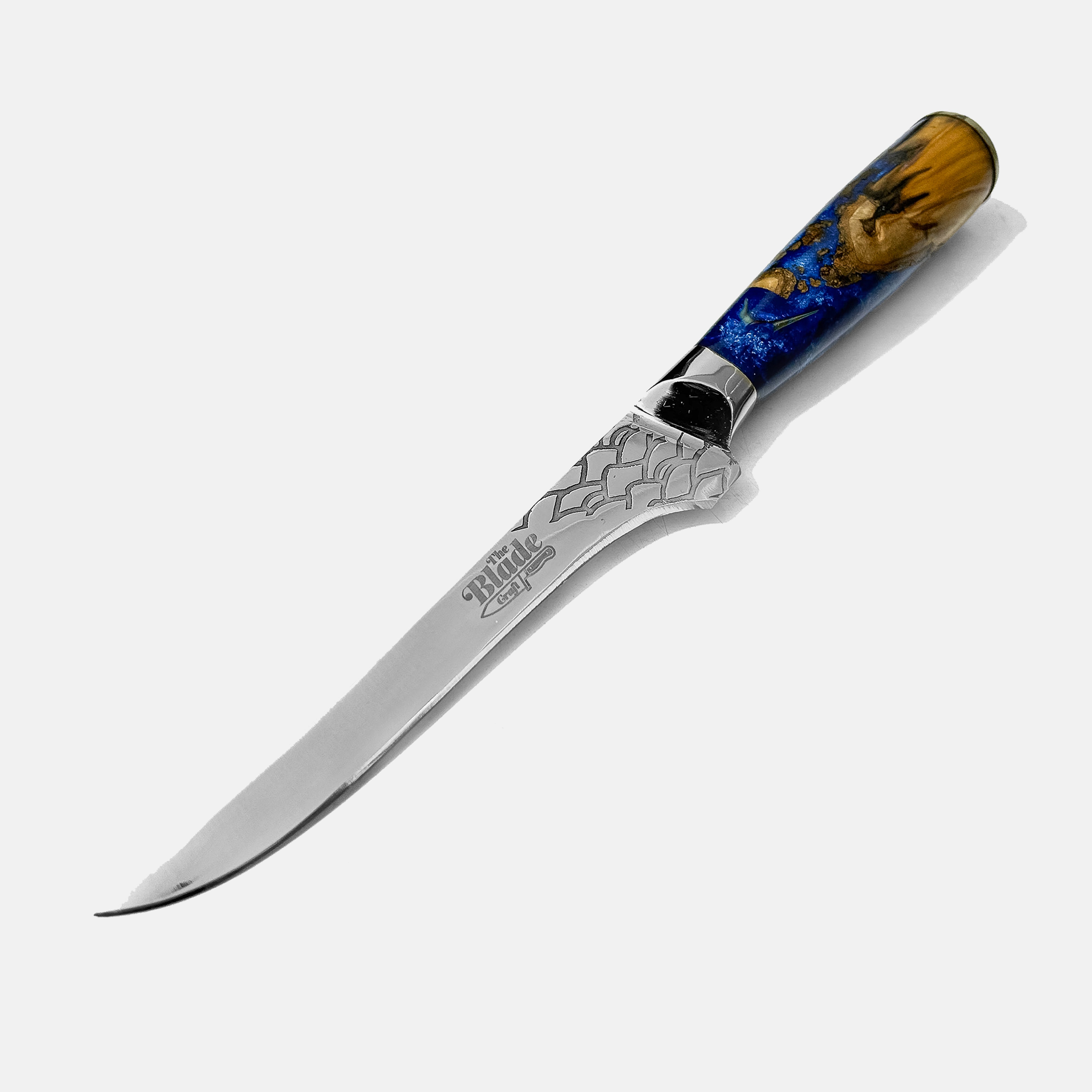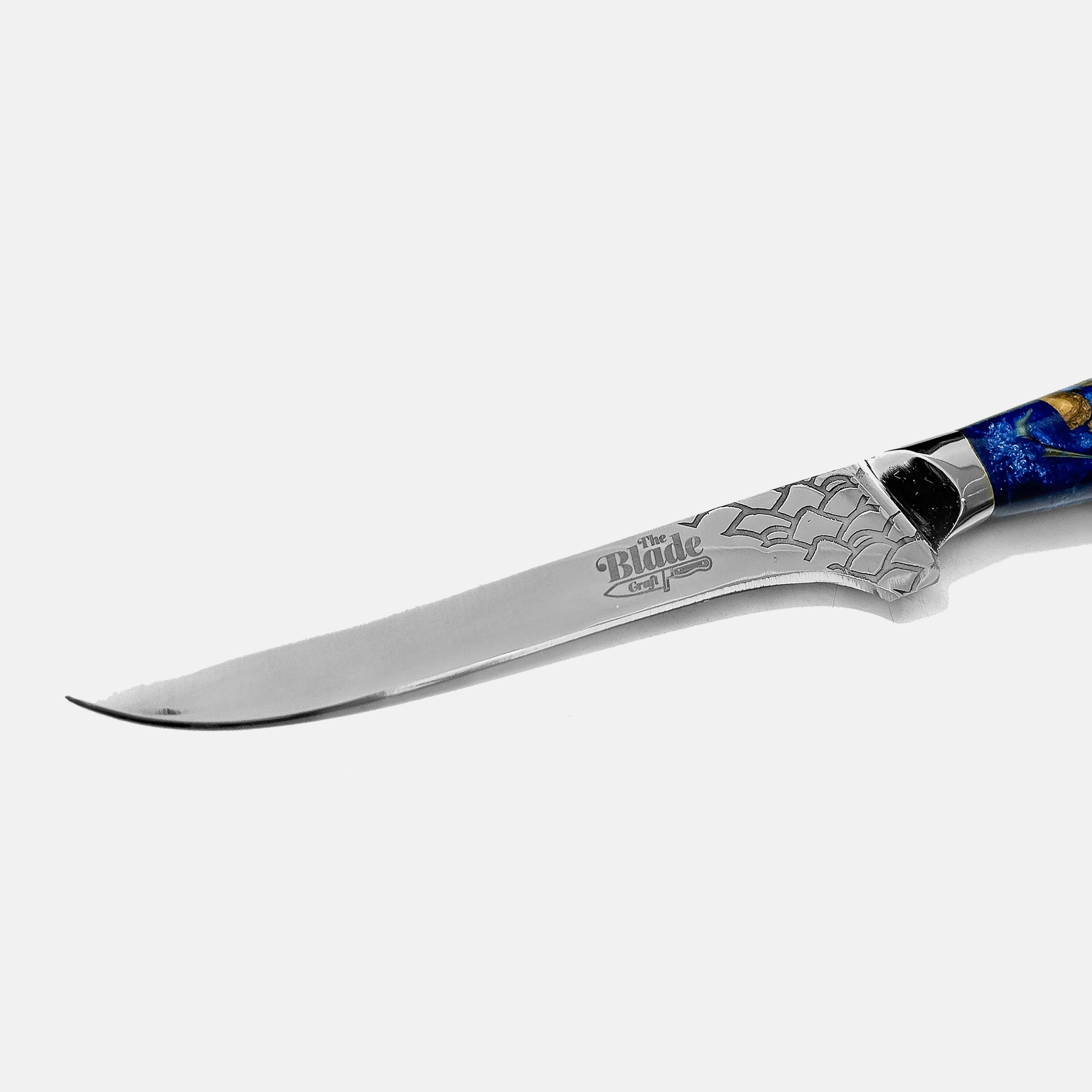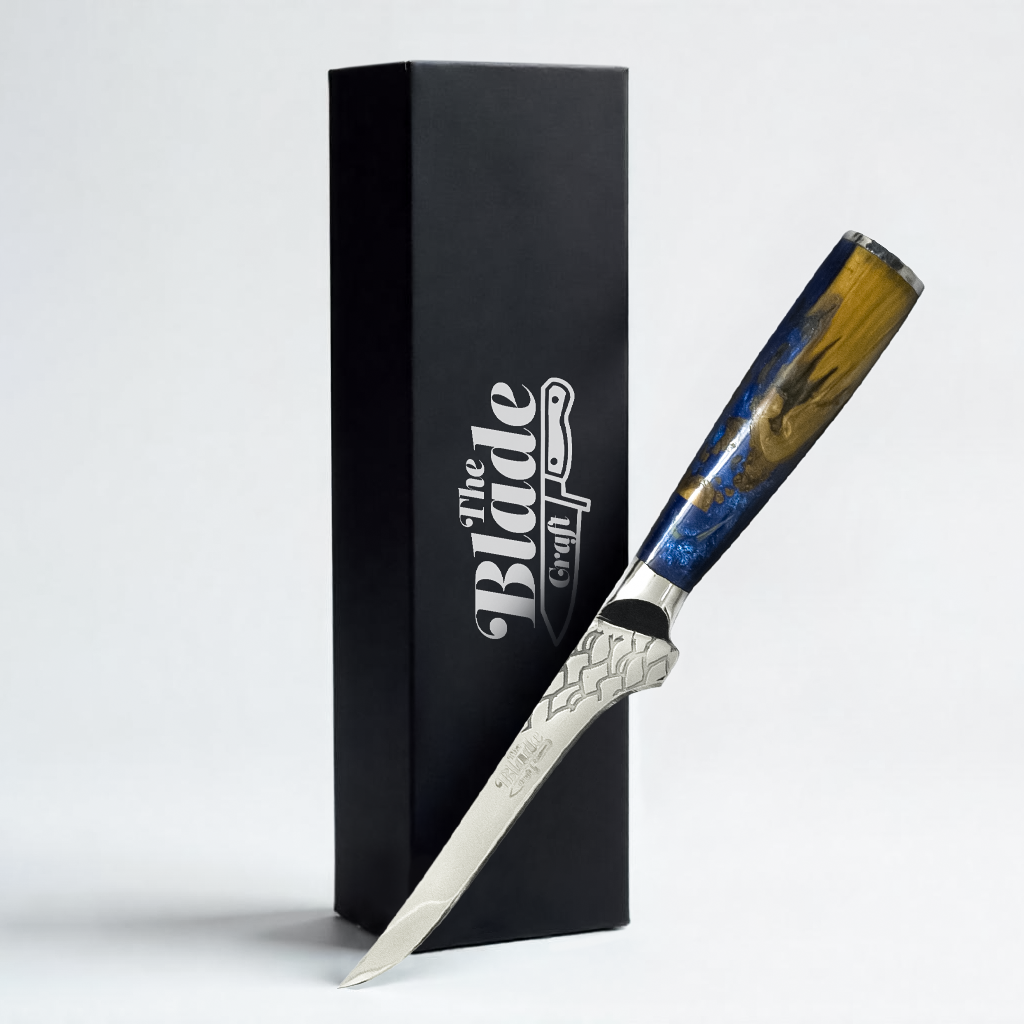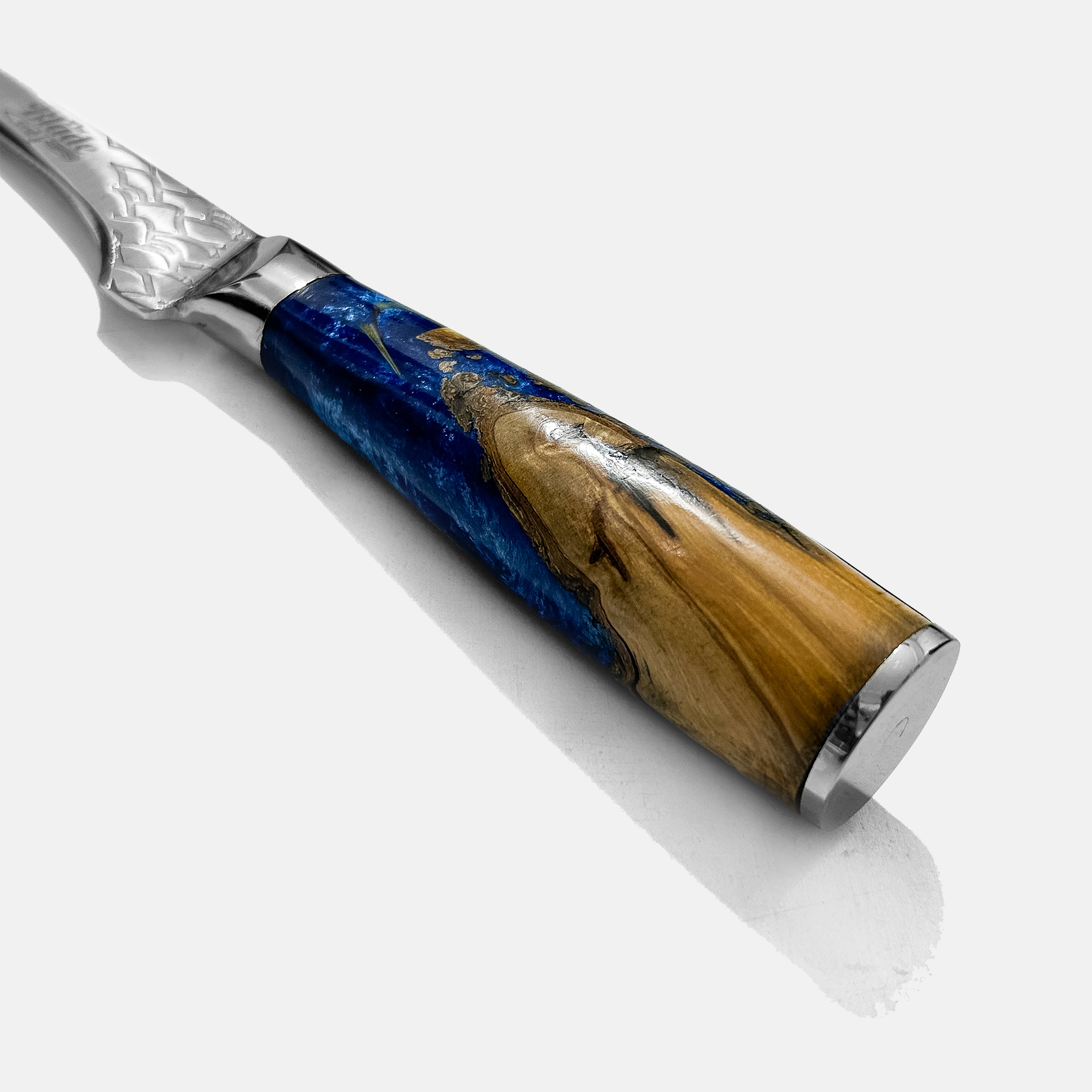 The 5.1-inch ergonomic handle, which is composed of stabilised wood and vivid blue resin, provides a firm, comfortable grip for precise manoeuvring. Whether you're working with beef, poultry, or fish, this boning knife gives you the control you need to get expert-level results.