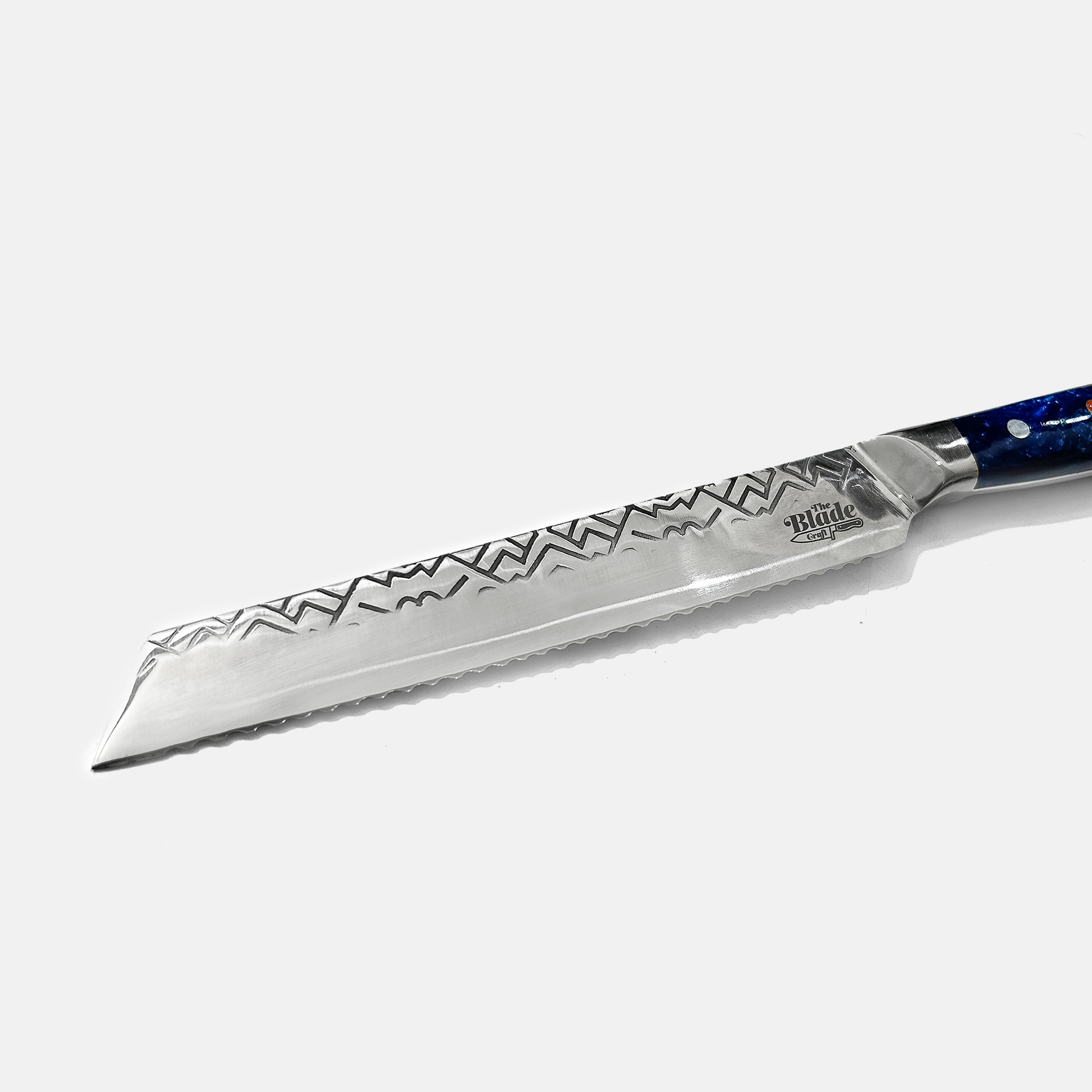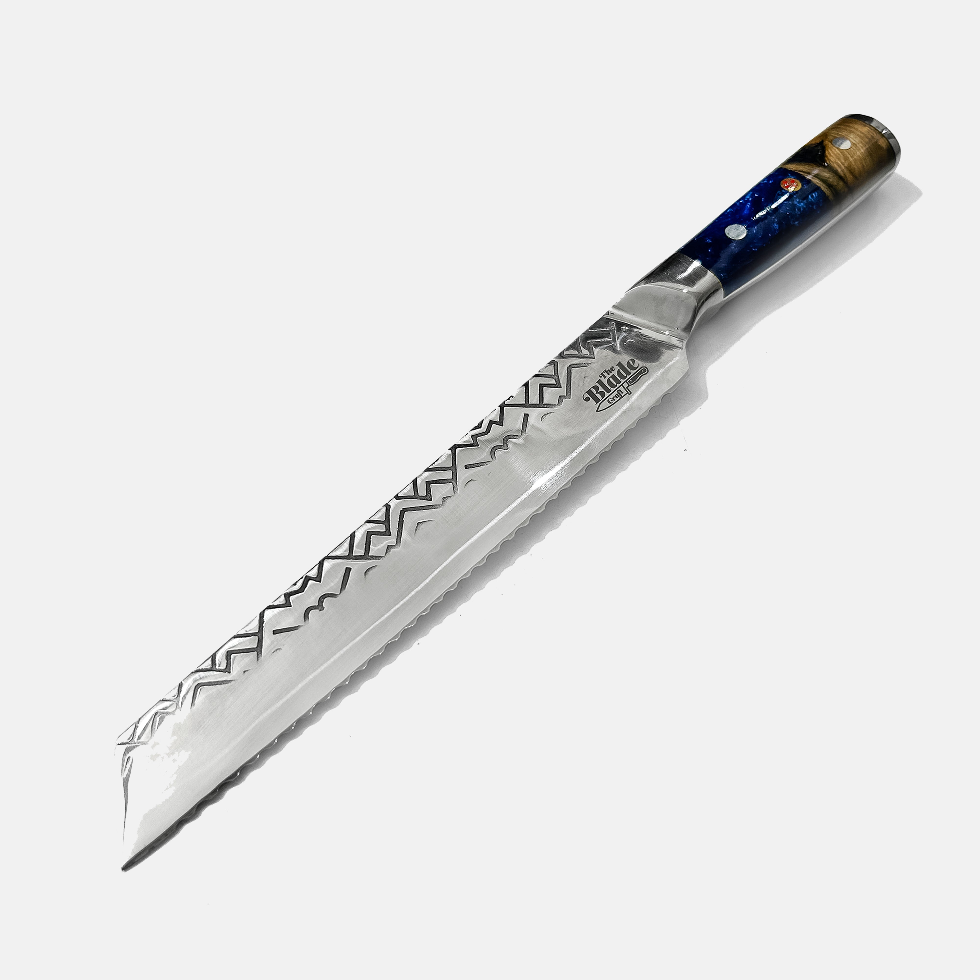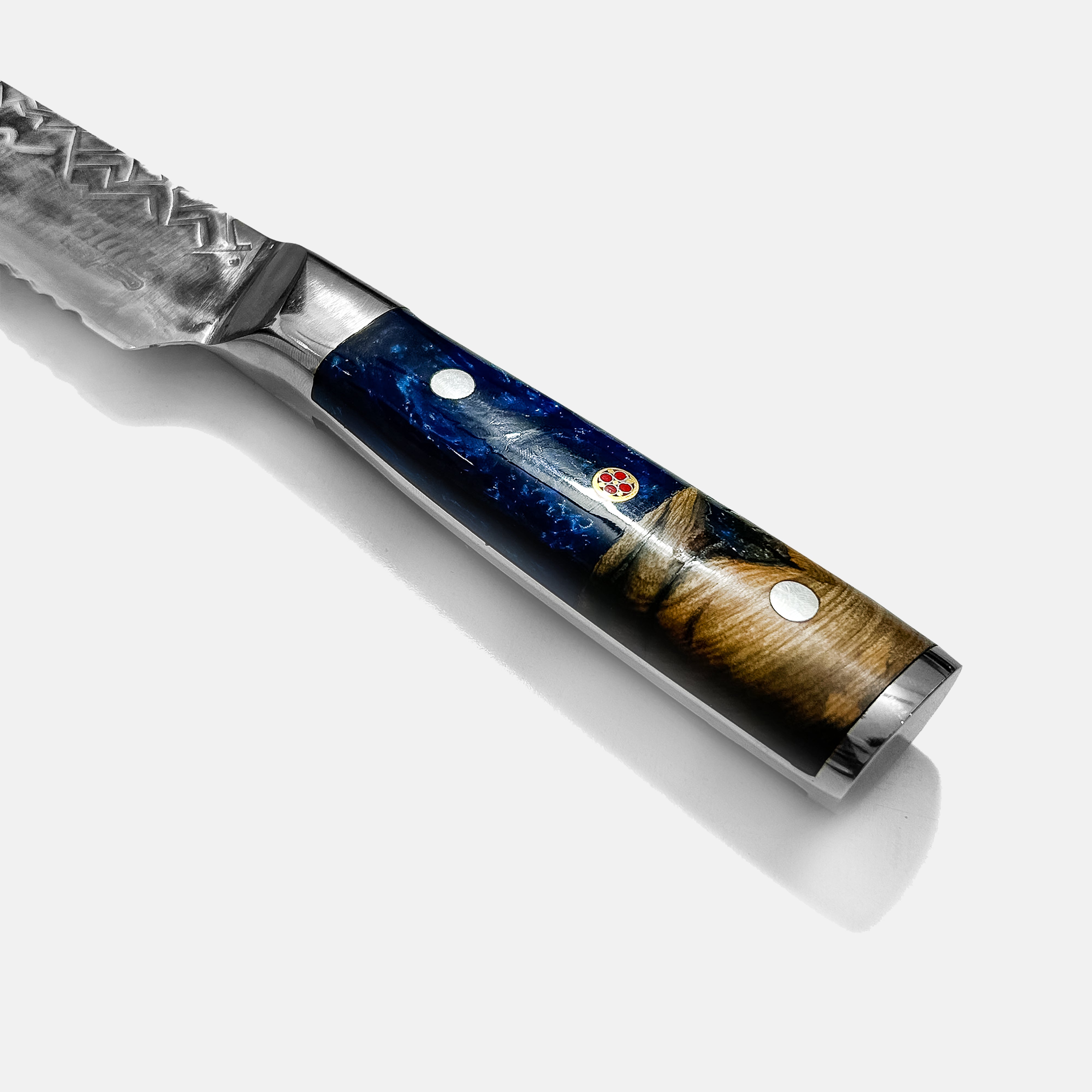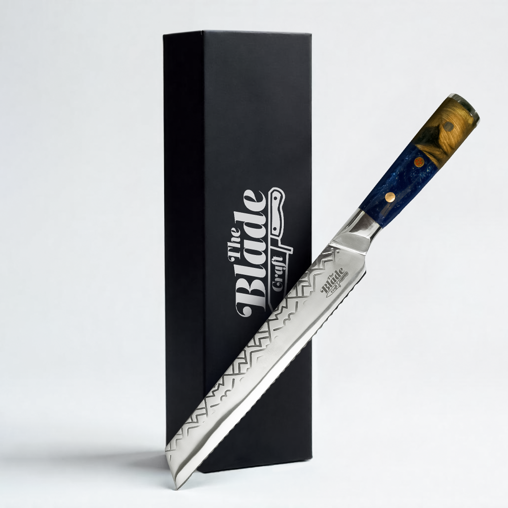 Constructed from a combination of stabilised wood and deep blue resin, the 5.1-inch handle is ergonomically designed for comfort and control. With a blade thickness of 2.8mm and a weight of about 264g, this bread knife feels balanced—substantial enough for confident handling without being heavy.