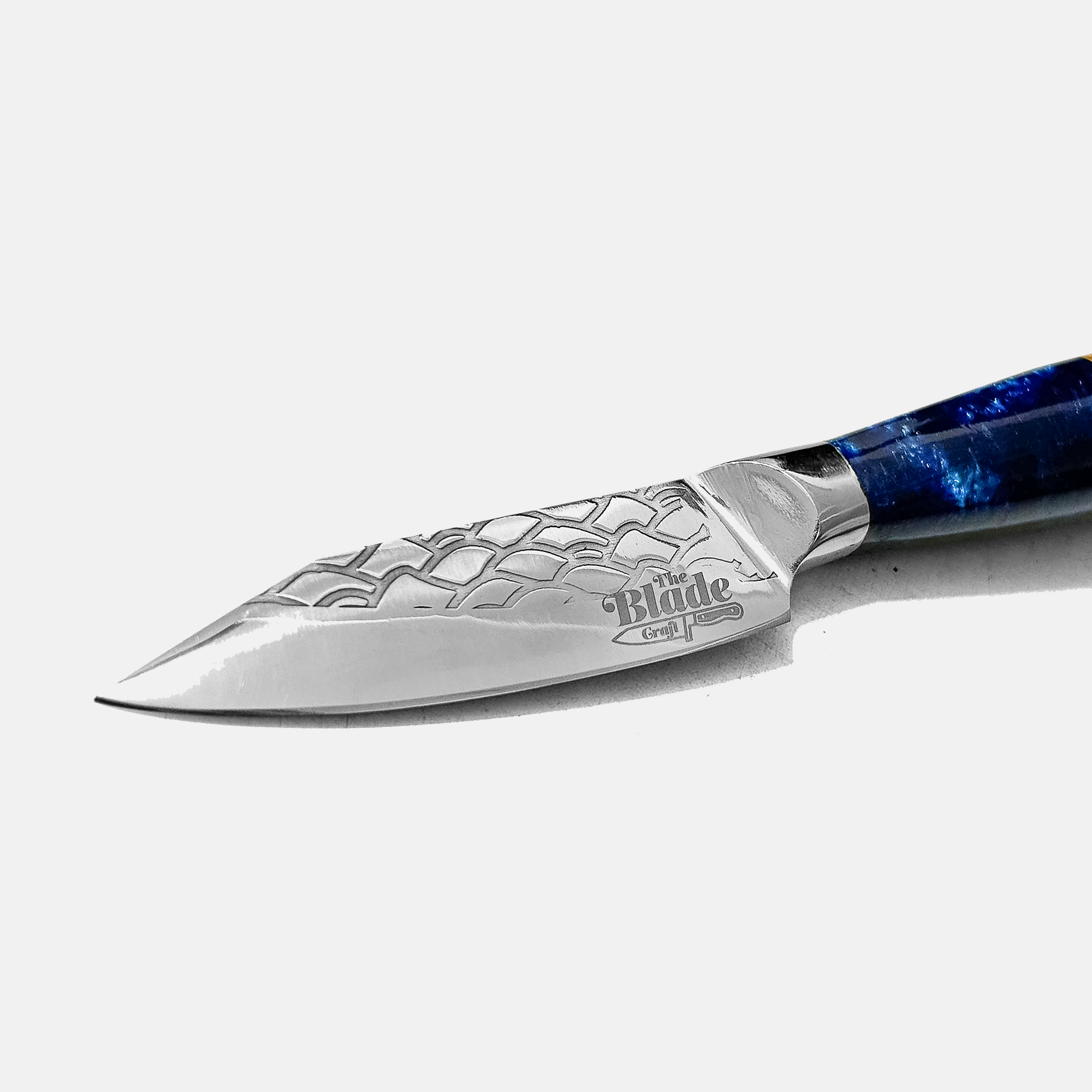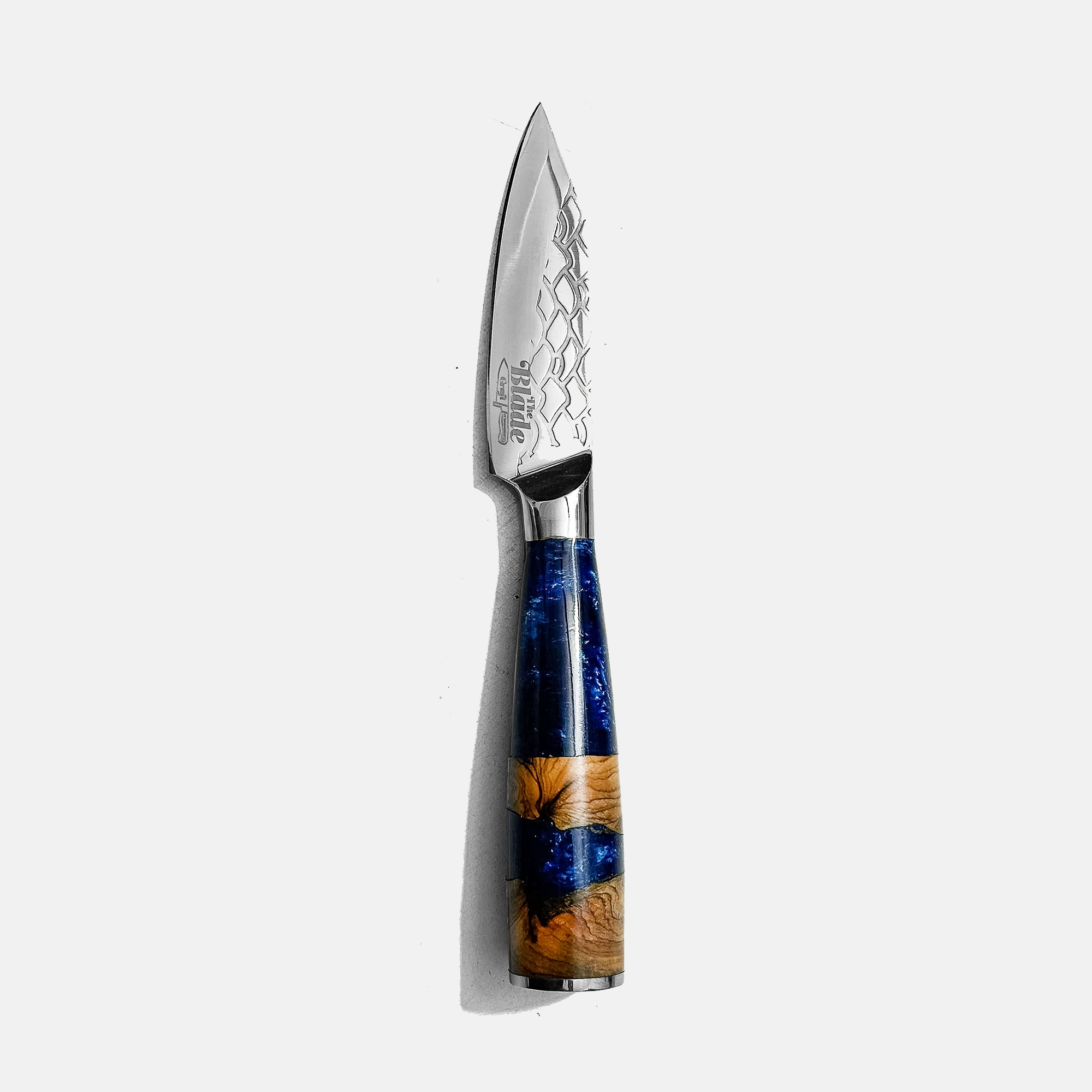 Made from vibrant blue resin and stabilised wood, the ergonomic handle is made for precise handling. The handle, which is 5 inches long and fits comfortably in the hand, offers balance and stability for delicate work.