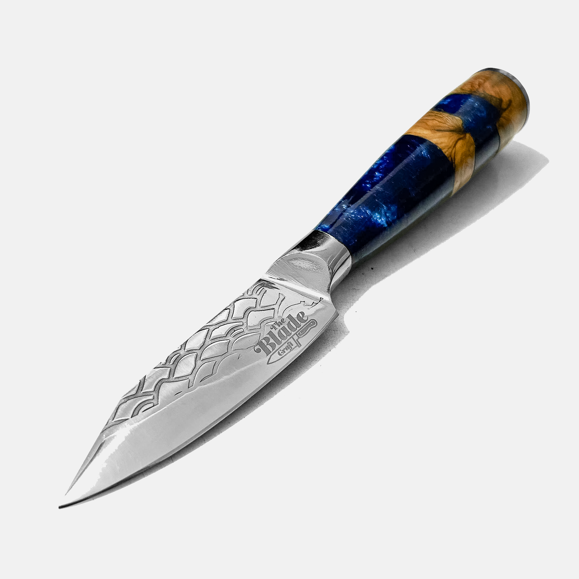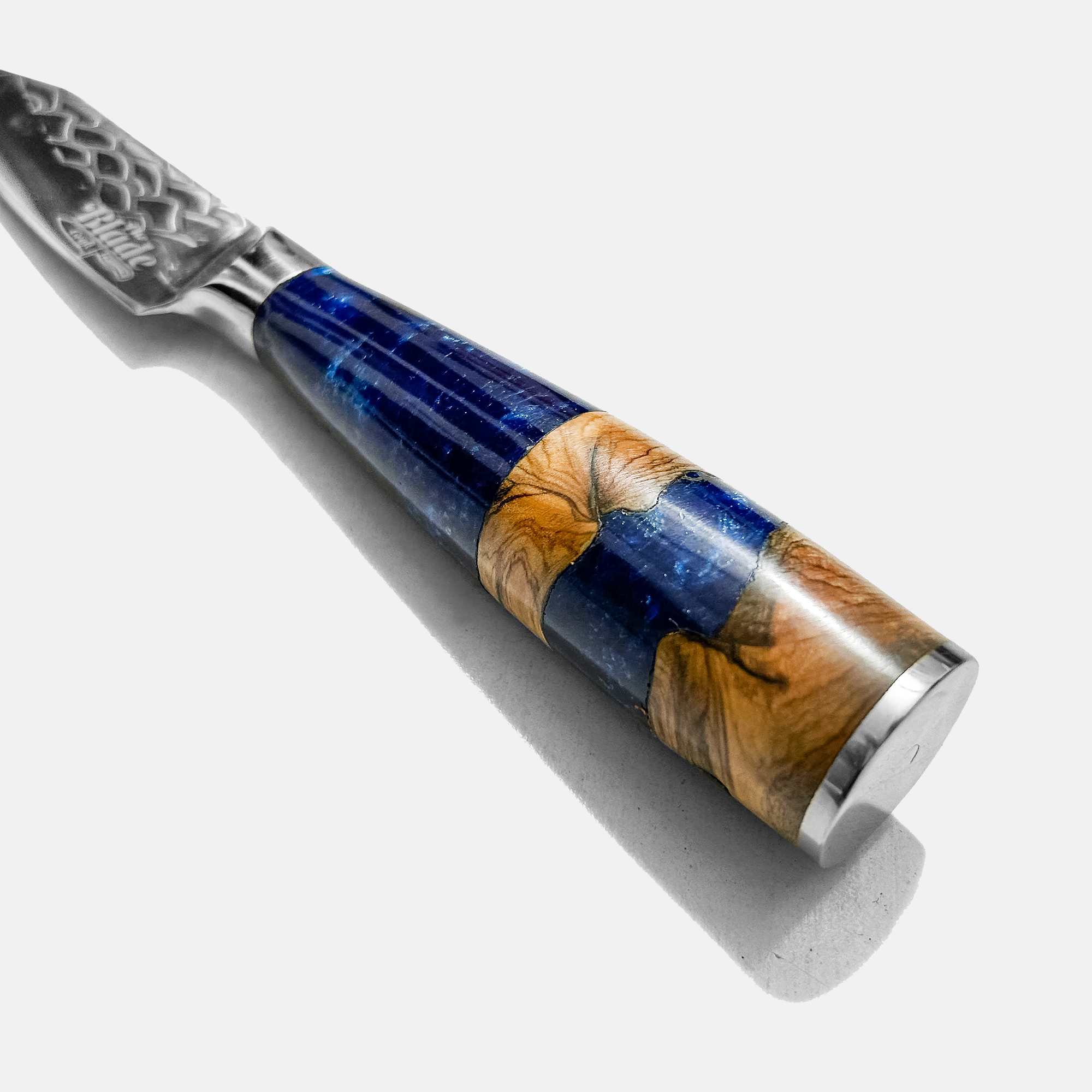 5 inches long, combining stabilized wood with striking blue resin, secured with polished rivets for comfort and control.