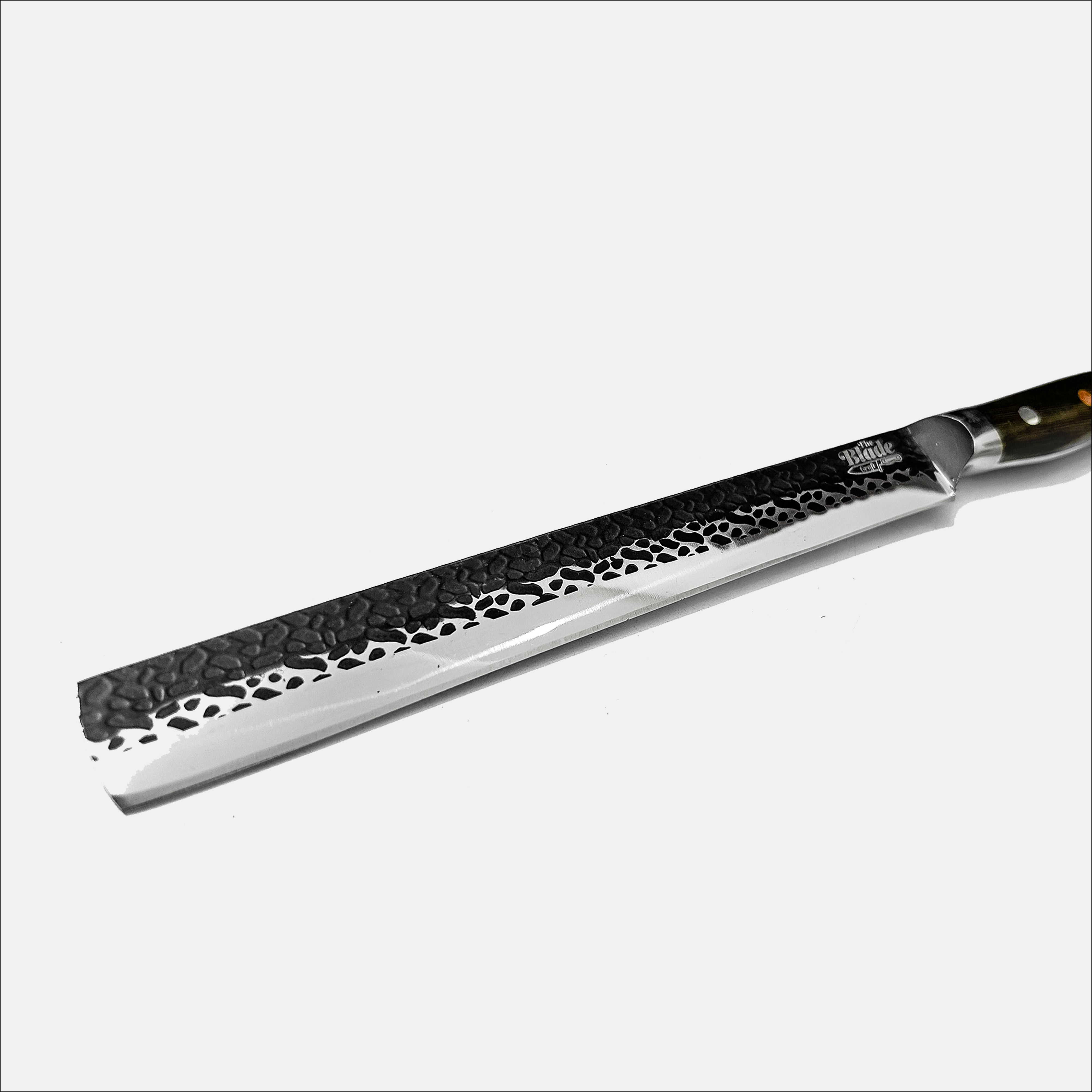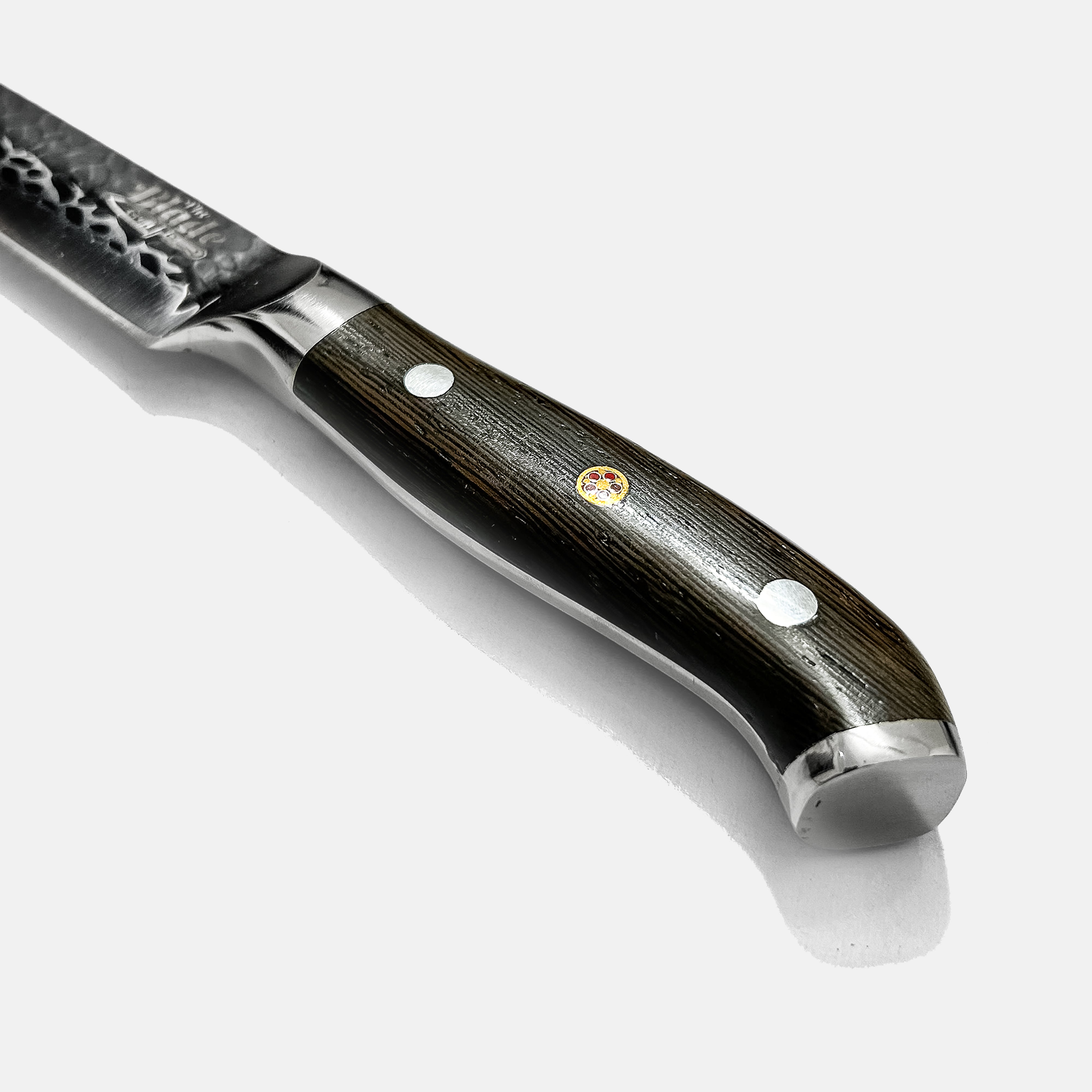 The slicer is hand-forged from our 224-layer Damascus steel blend, which combines AISI 4340 nickel alloy steel and AISI 5160 high carbon spring steel for exceptional strength, durability, and sharpness. Every slice can be made with fluid motion and precise control thanks to the hammered finish along the blade's spine, which also lessens drag and food sticking.