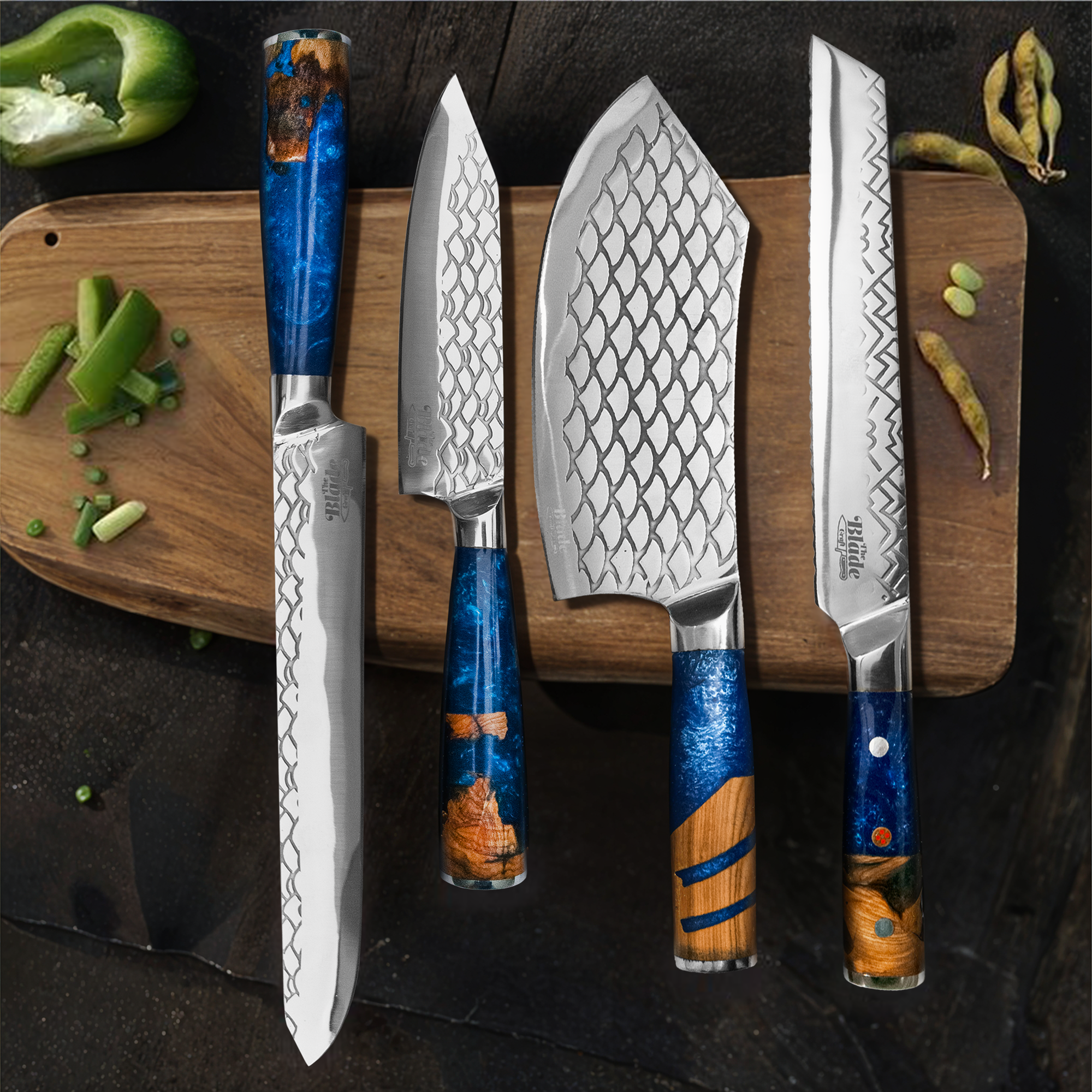 A versatile kitchen workhorse with a unique fish-scale textured blade, perfect for general chopping and dicing, all beautifully balanced with its eye-catching blue resin handle.