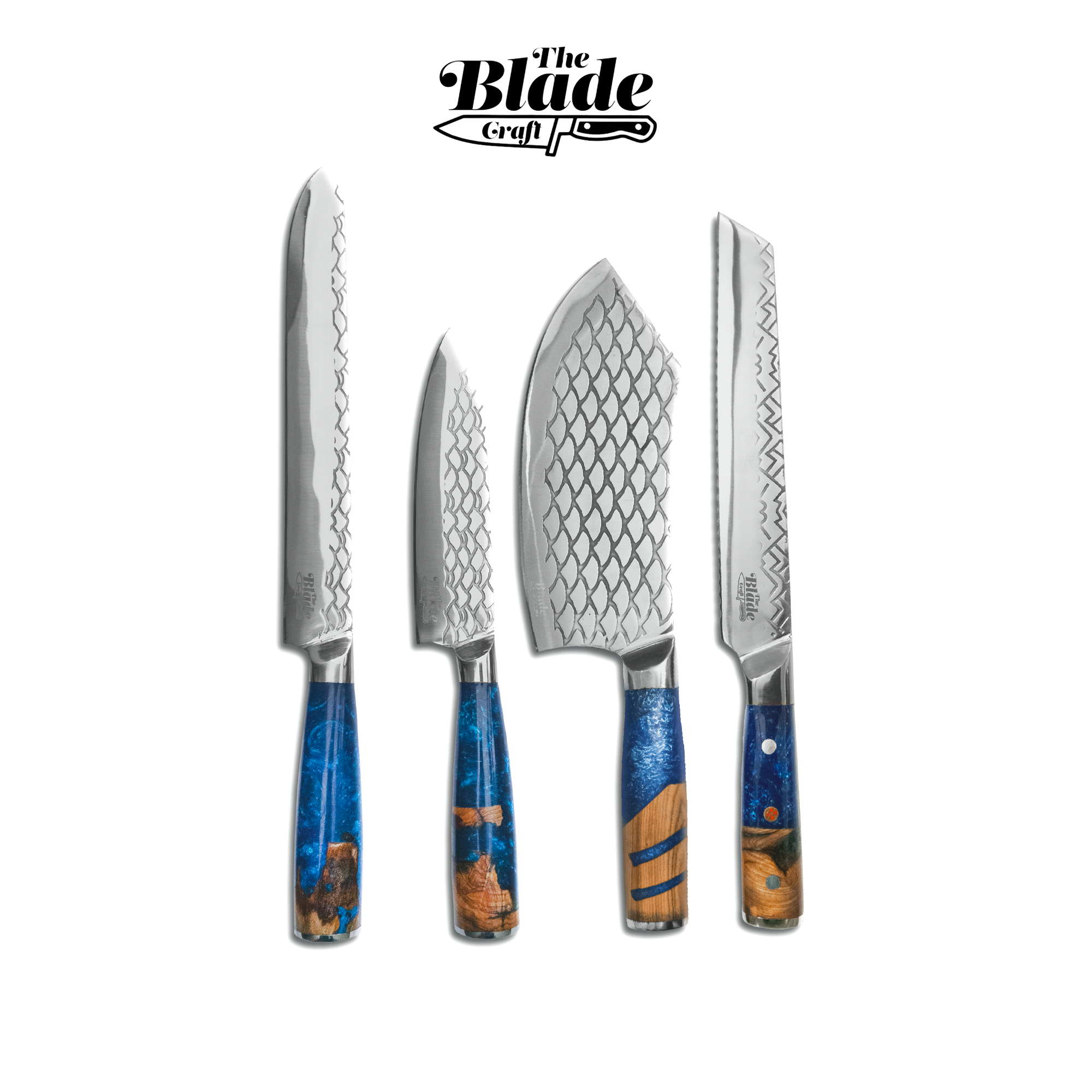 With The Blade Craft's BladeWave Series, discover a whole new level of culinary artistry. Discard all of your preconceived notions about kitchen knives; this is an experience rather than merely a tool for cutting. You'll notice the difference as soon as you hold a BladeWave knife. With handles made of a vivid blue resin swirling with natural wood, each piece is a stunning combination of form and function, creating a one-of-a-kind work of art.