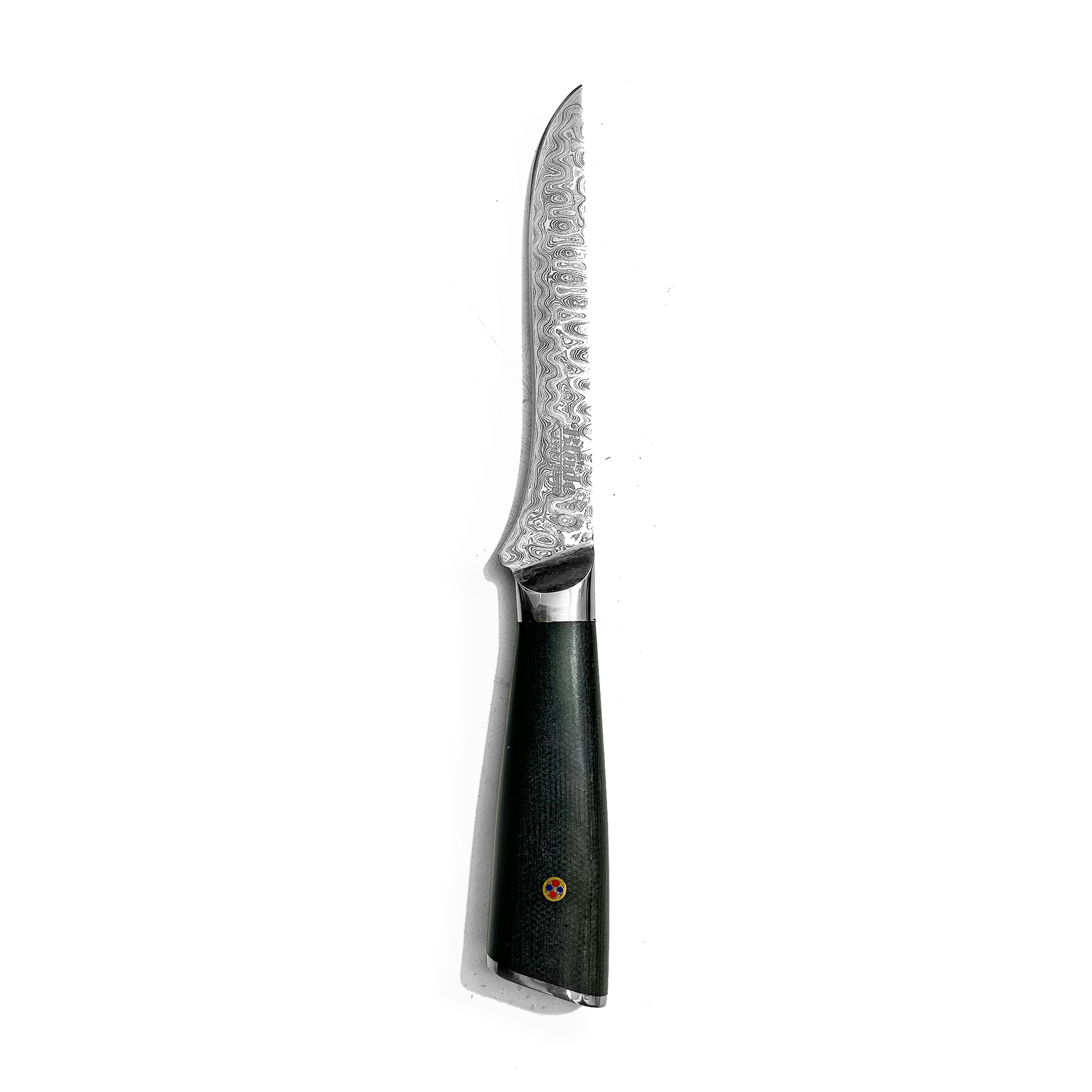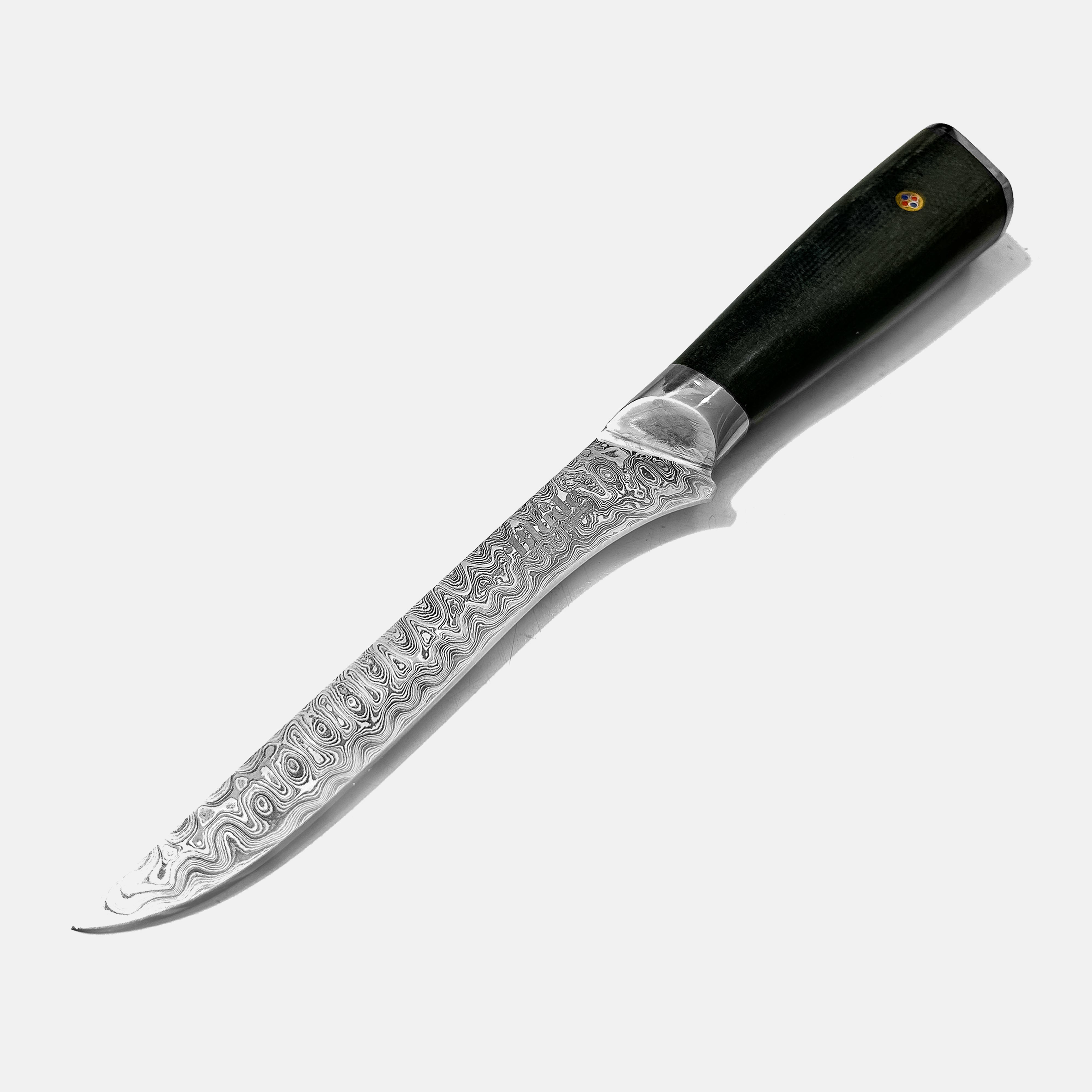 Forged from 224 layers of Damascus steel (AISI 5160 + AISI 4340), it boasts a razor-sharp finish, outstanding hardness, and edge retention. The narrow, 2.8 mm thick blade cuts cleanly through bones and joints, reducing waste and maintaining the quality of your cuts.