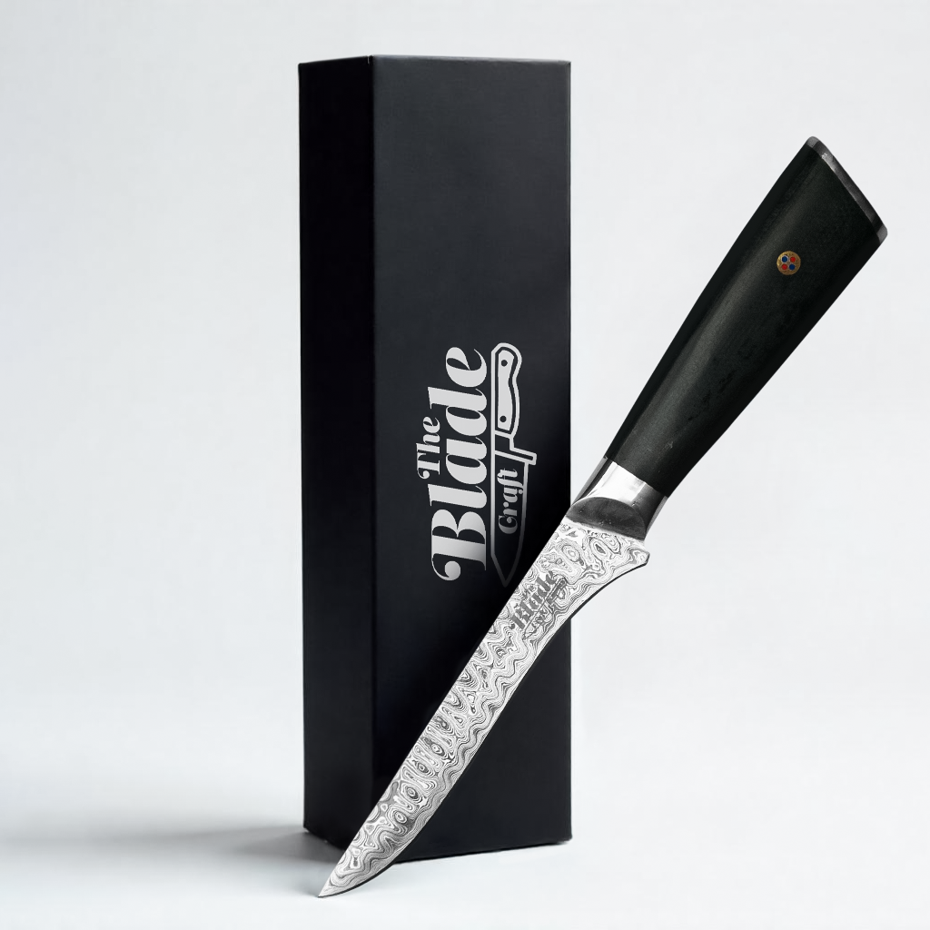 The TitanForge Series Boning Knife is designed for home cooks and chefs who require the highest levels of control as well as accuracy when handling bones. This knife's 4.9-inch aesthetically pleasing handle and 5.5-inch Damascus steel blade guarantee smooth separations and quick maneuvering.