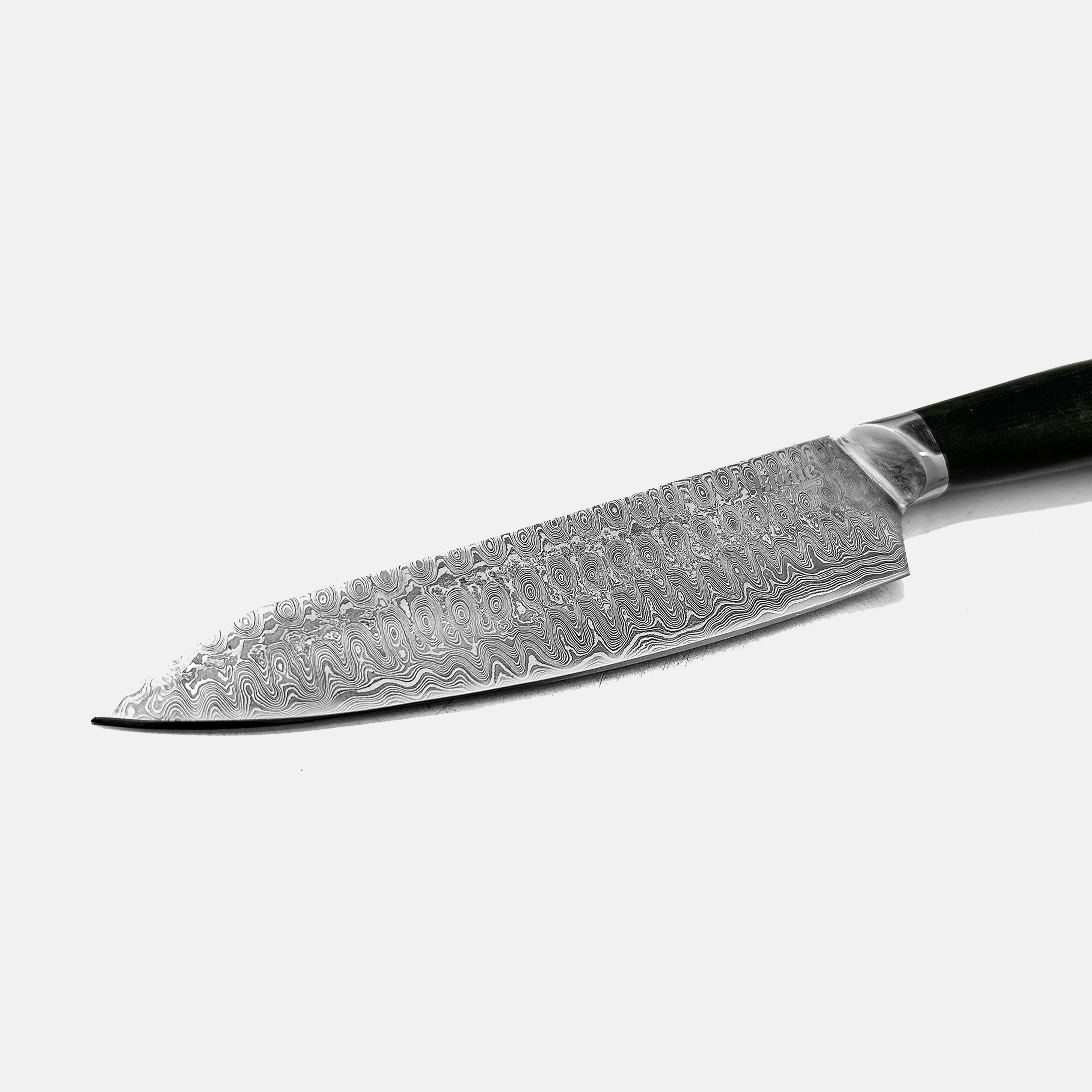 This knife's full tang 5.1-inch functional handle and 2.8 mm blade thickness offer the ideal balance, control, and comfort required for both quick prep and fine, detailed work. Chopping and mincing are made easier by the easy rocking motion made possible by the slightly curved belly and finely sharpened edge.
