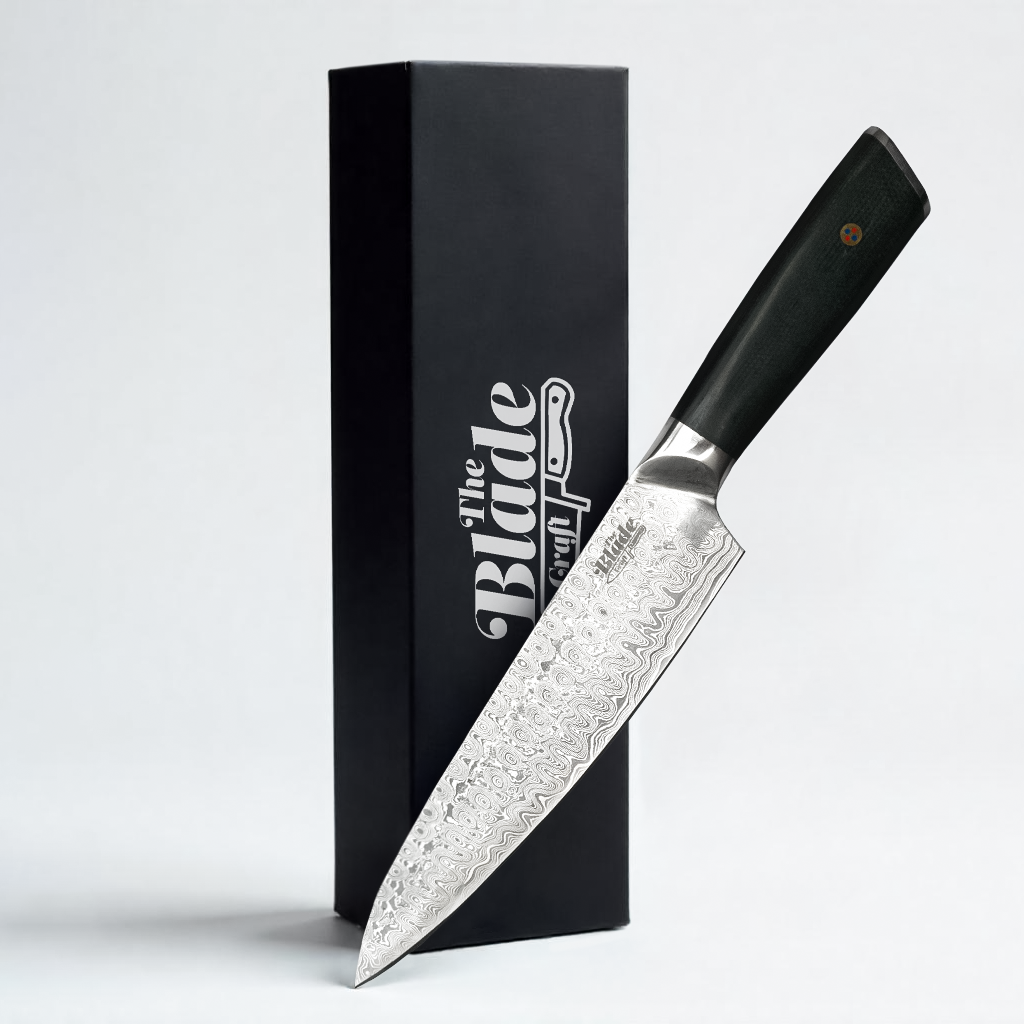The focal point of any serious kitchen is the TitanForge Series Chef Knife. It can easily handle a variety of tasks, from slicing meat and herbs to preparing fruits and vegetables, thanks to its 7.7-inch blade made from 224 layers of Damascus steel.